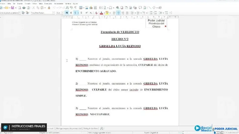El jurado recibirá siete formularios de veredicto, uno por cada imputado. Cada formulario incluirá varias opciones posibles, y la magistrada les indicará cómo deben completarlos correctamente. "Ustedes deben tomar una decisión basada en las pruebas que relacionan a cada acusado con el hecho", señaló, recordando que se presume la inocencia de todas las personas juzgadas.