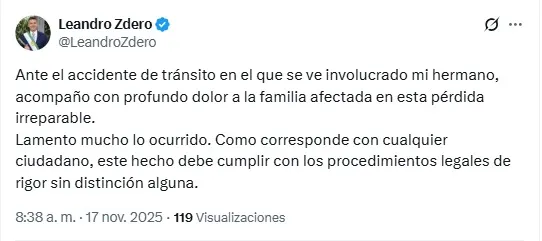 Este lunes, el gobernador Zdero se refirió al hecho mediante un comunicado en redes sociales:"Ante el accidente de tránsito en el que se ve involucrado mi hermano, acompaño con profundo dolor a la familia afectada en esta pérdida irreparable. Lamento mucho lo ocurrido. Como corresponde con cualquier ciudadano, este hecho debe cumplir los procedimientos legales de rigor sin distinción alguna", expresó.
