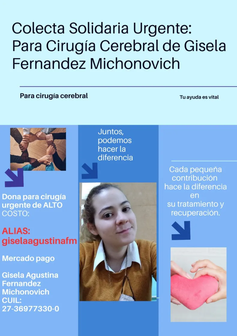 En medio de una situación crítica de salud, se lleva adelante una colecta solidaria para colaborar con la cirugía cerebral de Gisela Agustina Fernandez Michonovich, docente de la E.E.S N°68 "María Elena Walsh", quien necesita someterse a un procedimiento urgente cuyo costo asciende a 5 millones de pesos.