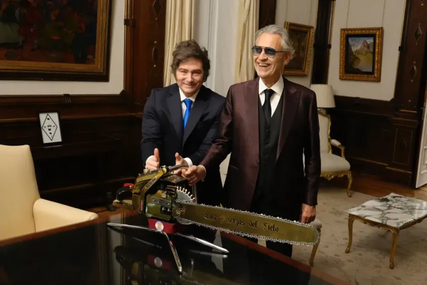 Además de dar un show privado en Casa Rosada, Bocelli fue invitado por Milei a "tocar" la famosa motosierra del mandatario, con hojas doradas y la frase grabada "Las Fuerzas del Cielo", una de las tantas frases de su campaña presidencial.