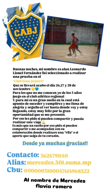 Alan Fernández es un joven chaqueño que desde los 3 años juega al fútbol en el Club Atlético Regional. Por su notable talento, fue seleccionado para probarse en el Club Boca Juniors, en Buenos Aires. La convocatoria lo llena de ilusión, ya que es el equipo de sus sueños.