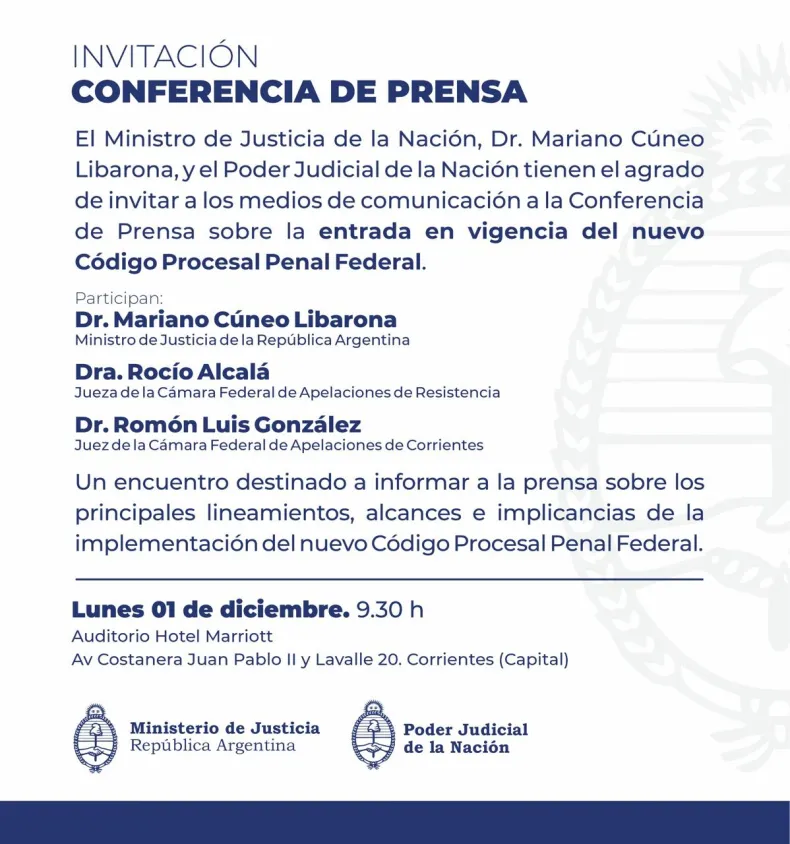 La actividad tiene como objetivo informar a la prensa sobre los principales puntos de la implementación del nuevo Código Procesal Penal Federal, sus alcances y las implicancias para el sistema judicial.