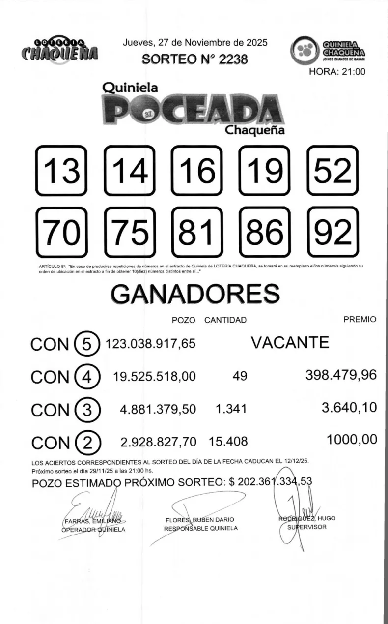 El sorteo N° 2238 de la Poceada chaqueña, realizado este jueves (27 de noviembre) por la noche, terminó sin ganadores de los cinco aciertos y dejó el pozo principal vacante. Con esto, el monto acumulado volvió a crecer y este sábado se pondrán en juego más de $ 202 millones.