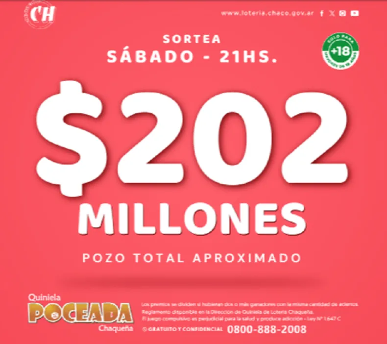 Este sábado 29 de noviembre se llevará adelante un nuevo sorteo de la Quiniela Poceada Chaqueña con un llamativo pozo: se pondrán 202 millones de pesos en juego.