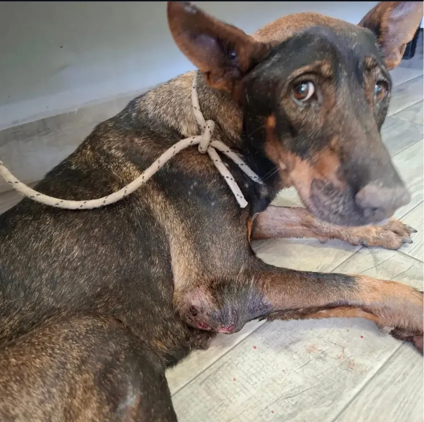La perrita que fue rescatada esta mañana en grave estado y que necesita una cirugía inmediata para sobrevivir. Según informaron, la mascota presenta una miasis severa en su miembro anterior derecho, lo que obligó a los veterinarios a decidir la amputación urgente para evitar que la infección avance.