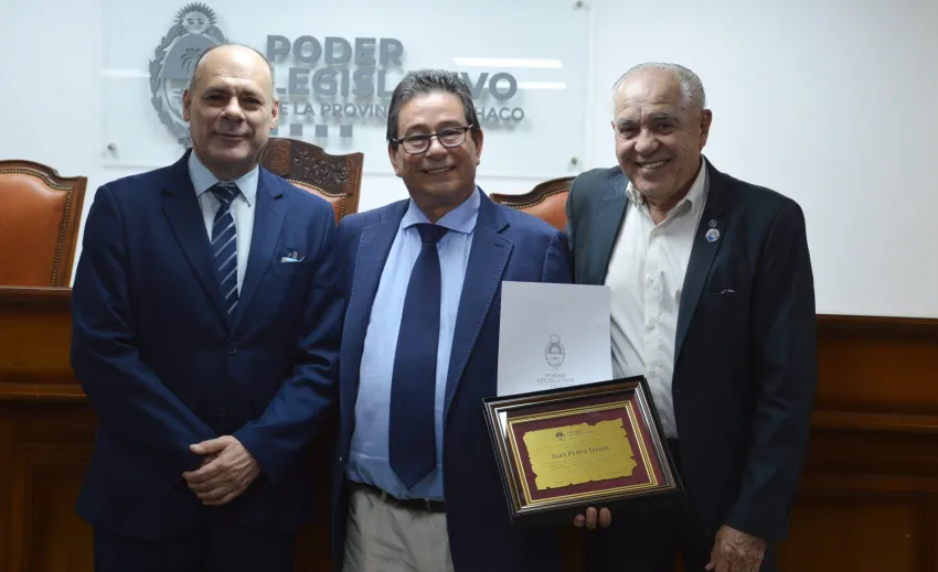 El juez del Superior Tribunal de Justicia del Chaco, Enrique Varela, y el procurador general Jorge Canteros participaron este martes del homenaje que la Legislatura provincial brindó al reconocido periodista Pedro Teruel, en el marco de sus 50 años de trayectoria en los medios de comunicación.