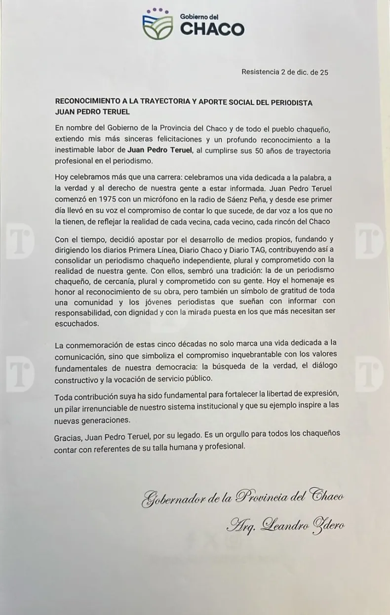 El reconocimiento también subraya que estas cinco décadas simbolizan un compromiso inquebrantable con valores fundamentales como la búsqueda de la verdad, el diálogo constructivo y la vocación de servicio público. "Gracias, Juan Pedro Teruel, por su legado. Es un orgullo para todos los chaqueños contar con referentes de su talla humana y profesional", concluye el saludo enviado por el mandatario provincial.