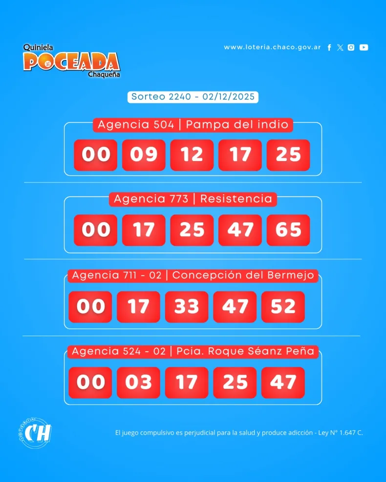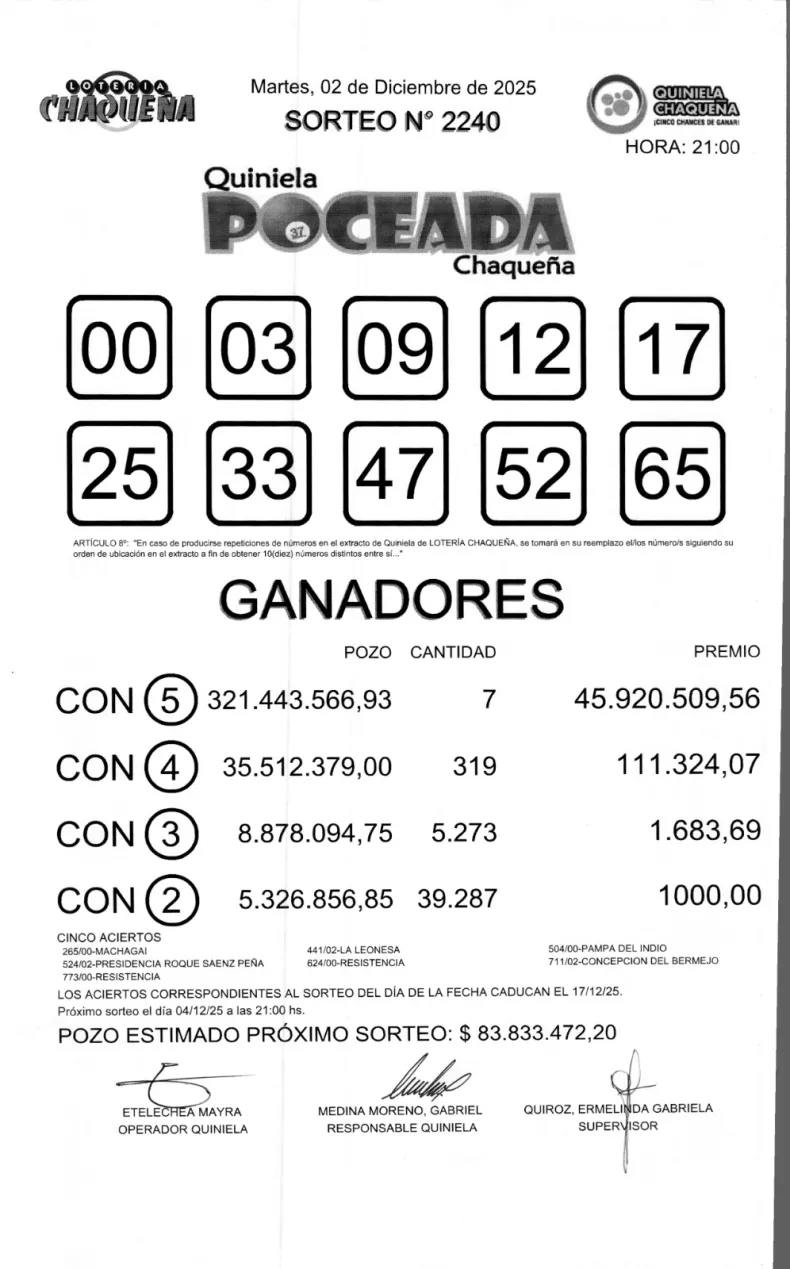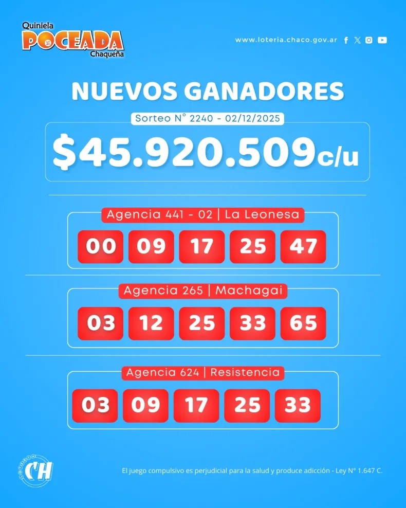 La Poceada Chaqueña volvió a repartir millones en toda la provincia. En el sorteo N° 2240, realizado este martes 2 de diciembre a las 21, siete apostadores lograron acertar los cinco números y se llevaron un premio individual de $ 45.920.509,56.