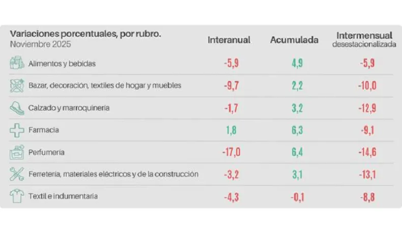 Al desagregar los datos, se evidenció una dinámica similar: seis de los siete rubros relevados presentaron retracciones, siendo los descensos más agudos los de Perfumería (-17%), Bazar y decoración (-9,7%) y Alimentos y bebidas (-5,9%). En contrapartida, el único sector con un crecimiento interanual fue Farmacia, con una suba del 1,8%.
