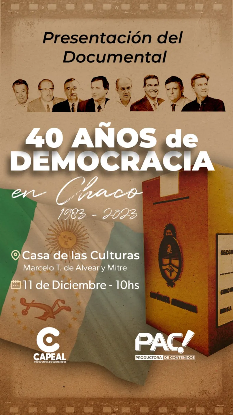 El jueves 11 a las 10 de la mañana se presenta en el auditorio de la Casa de las Culturas el piloto del documental "40 años de Democracia: 1983-2023". Aborda hechos clave que atravesaron a la provincia y al país en las últimas cuatro décadas.