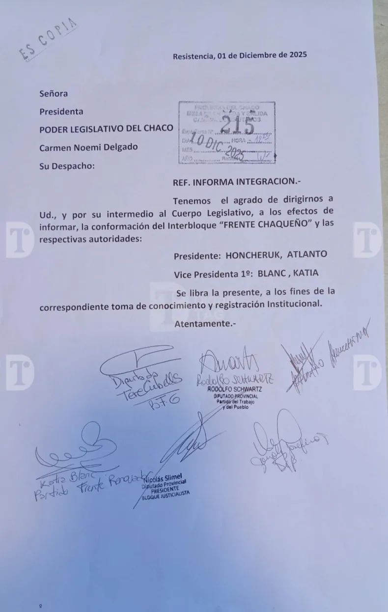 La Cámara de Diputados del Chaco formalizó la creación del Interbloque "Frente Chaqueño", luego de que la presidenta del Poder Legislativo, Carmen Delgado, recibiera la nota de constitución fechada el 1 de diciembre.