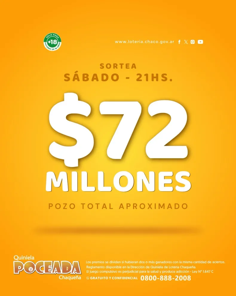El próximo sorteo de la Poceada se realizará el sábado 13 de diciembre a las 21 horas, con un pozo estimado en $ 72 millones.