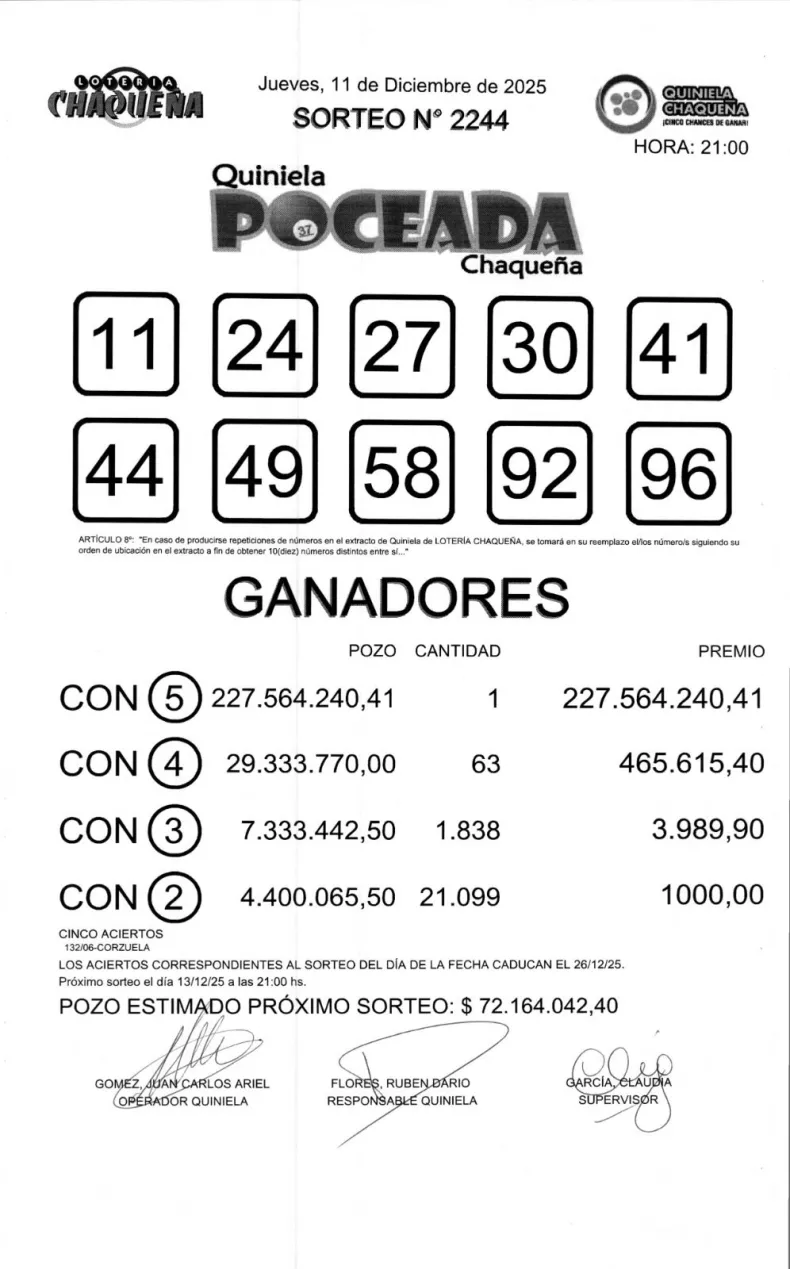 Un apostador de la localidad de Corzuela se convirtió en el nuevo ganador de la Poceada Chaqueña al llevarse un premio superior a los $ 227 millones, tras acertar los cinco números del sorteo N° 2244 realizado en la noche de este jueves.
