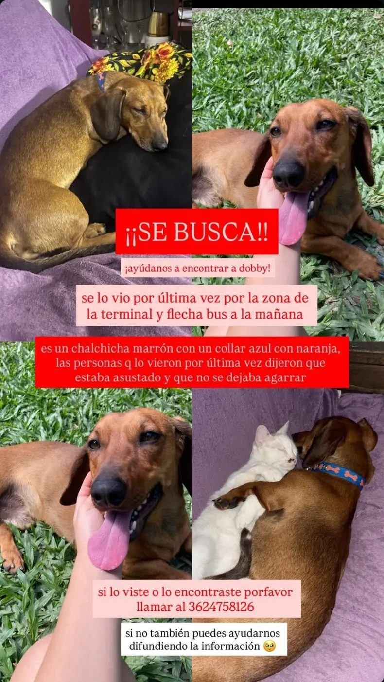 Según informó su dueña, el animal fue visto por última vez en la zona de la terminal de ómnibus y Flecha Bus.Dobby llevaba puesto un collar azul con naranja y, de acuerdo con testigos, se encontraba asustado y no se dejaba agarrar.