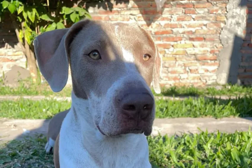 Se trata de una perra de 2 años y cuatro meses, de tamaño mediano y cruza con Pitbull. Tiene manchas color marrón en la cara y en el cuerpo.