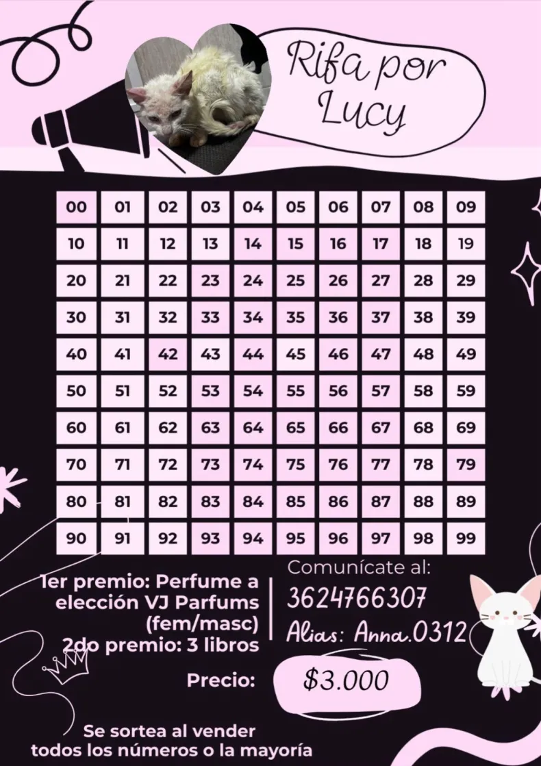 Aquellos que quieran ayudar a "Lucy" con su tratamiento y que pueda vivir, pueden comunicarse al número 3624766307 y comprar una rifa a un precio accesible de $ 3 mil, transfiriendo al alias: Anna.0312."De todos modos, si no quieren comprar una rifa y solo realizar donaciones, una donación mínima de $ 10, $ 100 o $ 1000, sirve, ya que todo suma para seguir su tratamiento. De verdad queremos que sobreviva", cierra Anna.