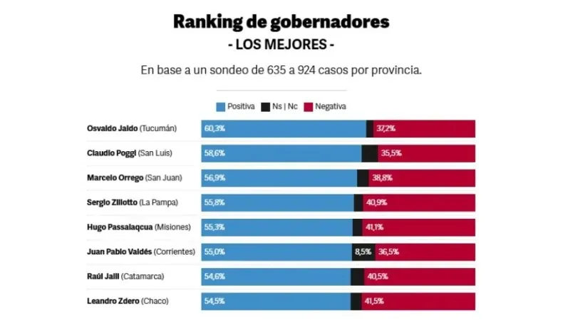 Según detalla CB Consultora, Jaldo lidera el ranking con un 60,3% de imagen positiva, seguido por Claudio Poggi (San Luis), con un 58,6%, y Marcelo Orrego (San Juan), con un 56,9%. En líneas generales, el informe señala que los gobernadores con mayor cercanía política al presidente Milei tienden a ubicarse en los primeros lugares, mientras que los más opositores aparecen relegados.