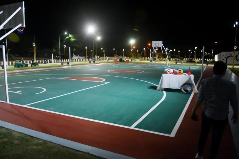 En tanto, el Parque Deportivo del barrio Sur, financiado por Lotería Chaqueña y desarrollado en dos etapas, abarca más de 5.000 metros cuadrados. La obra incluyó la refuncionalización de un edificio existente como núcleo sanitario y la creación de un espacio deportivo multiuso frente a la Estación Histórica.