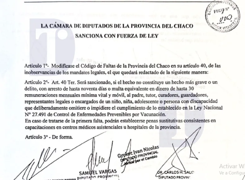 Un proyecto presentado en la Cámara de Diputados del Chaco propone sanciones severas para los padres o tutores que no vacunen a sus hijos, en el marco de la legislación vigente sobre prevención de enfermedades.