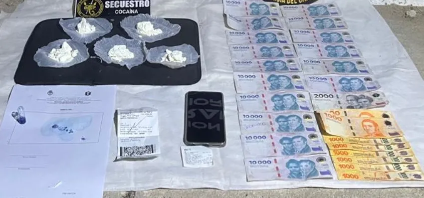 Durante la requisa se hallaron cinco envoltorios tipo "bochón" con cocaína, con un peso total de 100 gramos, además de $170.000 en efectivo, un teléfono celular y dos pasajes de ómnibus. La sustancia fue sometida a prueba de campo y pesaje, confirmándose que se trataba de clorhidrato de cocaína.