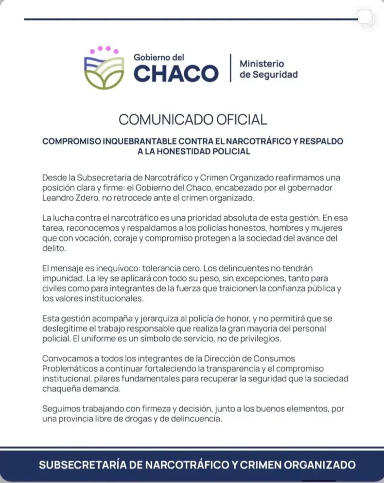 Asimismo, se advierte que no permitirán que hechos aislados deslegitimen el trabajo que realiza la gran mayoría del personal policial. "Seguimos trabajando con firmeza y decisión, junto a los buenos elementos, por una provincia libre de drogas y de delincuencia", concluye el comunicado.
