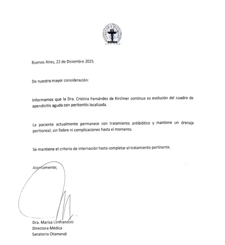 Cristina Fernández de Kirchner continúa internada en el Sanatorio Otamendi, donde permanece bajo seguimiento médico luego de haber sido intervenida quirúrgicamente por un cuadro de apendicitis aguda con peritonitis localizada. Según el último parte difundido este lunes por la mañana, su evolución es favorable y no presenta fiebre ni complicaciones adicionales.