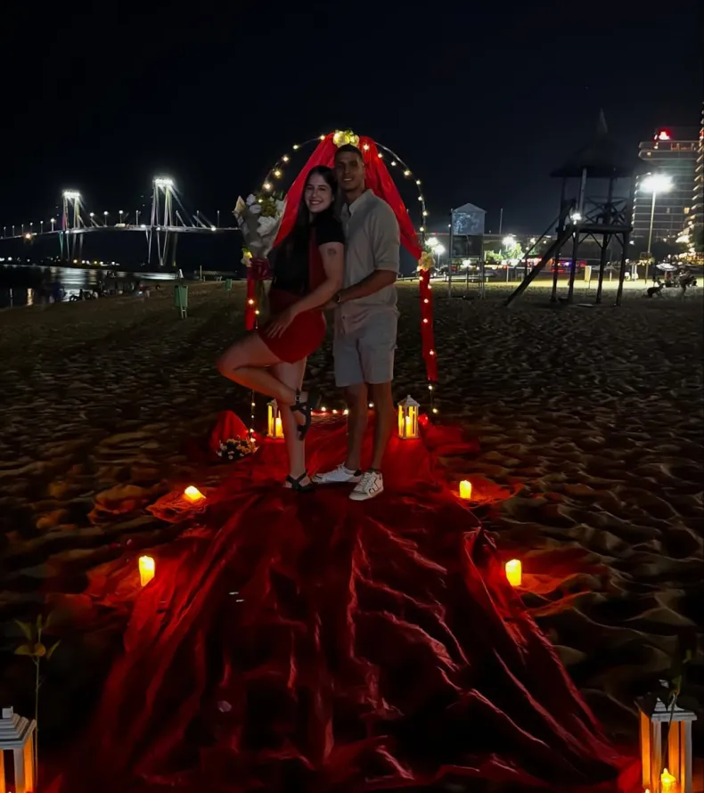 En medio de la playa, el lugar fue cuidadosamente ambientado con una tela roja extendida sobre la arena, velas encendidas y rosas, creando un marco romántico que acompañó el esperado "sí". Allí, los jóvenes chaqueños sellaron su compromiso y comenzaron oficialmente una nueva etapa juntos.