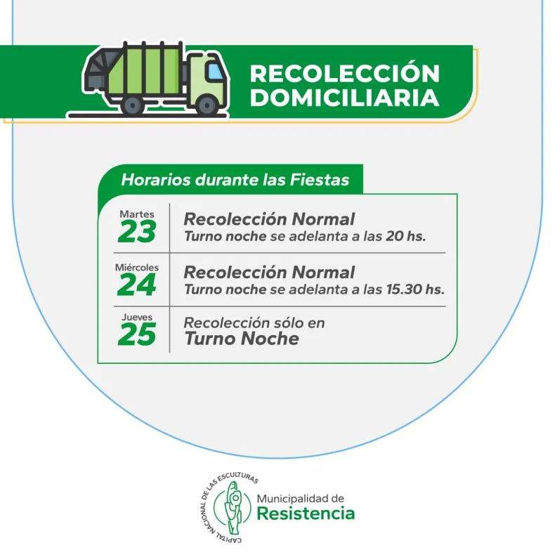 Desde la Municipalidad de Resistencia informaron a los vecinos de la ciudad cómo será el servicio de recolección de residuos en los próximos días, teniendo en cuenta las celebraciones y asuetos definidos por la celebración de Nochebuena y Navidad.