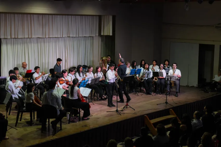 La presentación incluyó piezas de libertango, folclore, boleros, coplas españolas, clásicos italianos, jazz, mambos y cumbias, logrando cautivar a los presentes. La Orquesta, dirigida por el maestro Nicolás Santoro, está integrada por más de 40 alumnos, quienes demostraron el nivel y la excelencia musical alcanzados a lo largo del ciclo 2025.