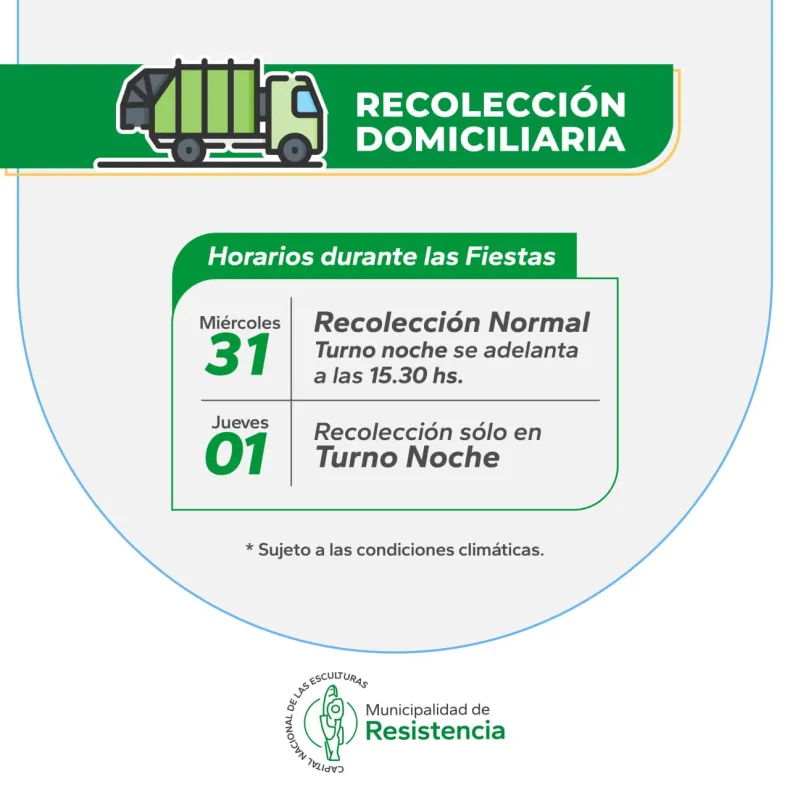 Desde la Municipalidad de Resistencia informaron a los vecinos de la ciudad cómo será el servicio de recolección de residuos en los próximos días, teniendo en cuenta las celebraciones y asuetos definidos por la celebración de Año Nuevo.
