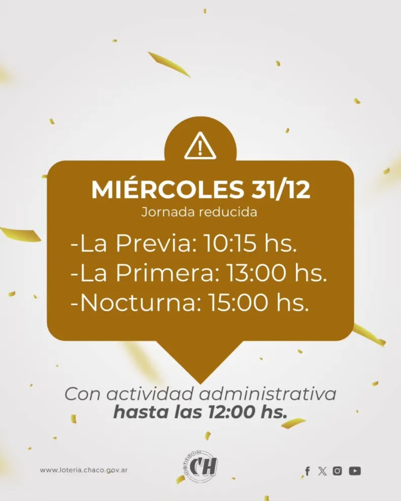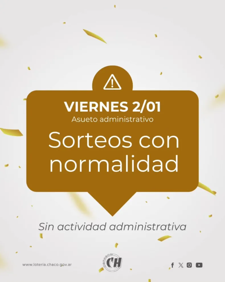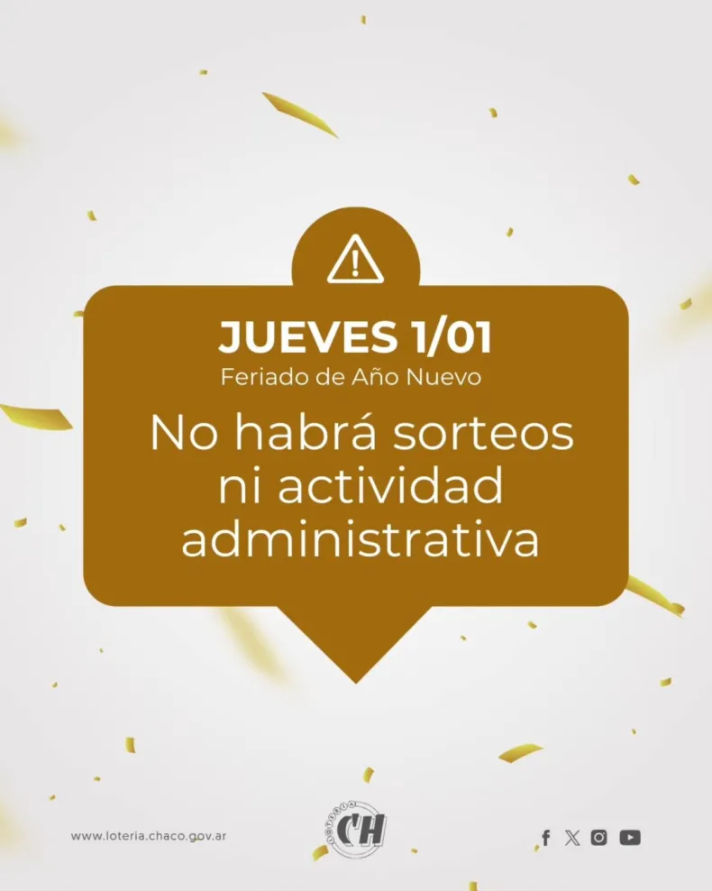 Lotería Chaqueña dio a conocer el esquema especial de sorteos previsto con motivo de los festejos de Año Nuevo, el cual contempla una jornada reducida el miércoles 31 de diciembre, la suspensión total de actividades el jueves 1 de enero y el retorno a la normalidad el viernes 2.