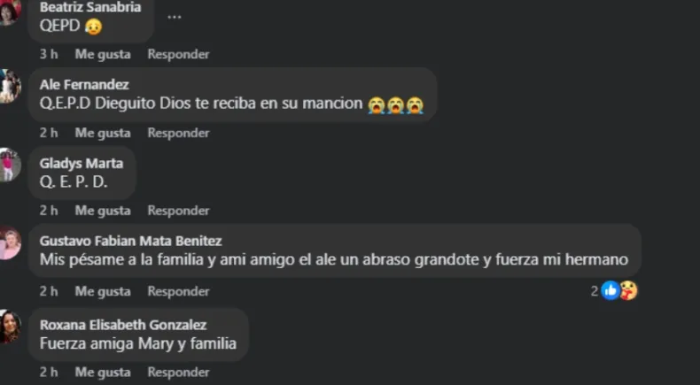Otro usuario expresó: "Mis más sentidos pésames para mi amigo Ale y su familia. Nadie merece un final así, menos siendo tan joven. Q.E.P.D., Diego". Incluso una docente del joven dejó un mensaje cargado de emoción al escribir simplemente: "¡Mi alumnito!", en una de las publicaciones.