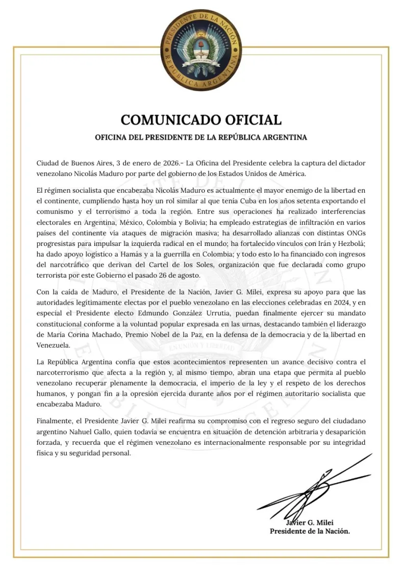 La República Argentina confía que estos acontecimientos representen un avance decisivo contra el narcoterrorismo que afecta a la región y, al mismo tiempo, abran una etapa que permita al pueblo venezolano recuperar plenamente la democracia, el imperio de la ley y el respeto de los derechos humanos, y pongan fin a la opresión ejercida durante años por el régimen autoritario socialista que encabezaba Maduro.