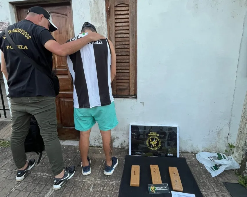 Durante el procedimiento, los efectivos identificaron y demoraron a un sujeto cuyas características coincidían con las aportadas previamente. El mismo fue identificado por sus iniciales G.L.M., quien tenía en su poder una bolsa blanca con tres panes rectangulares de marihuana, con un peso total de 2,010 kilogramos.