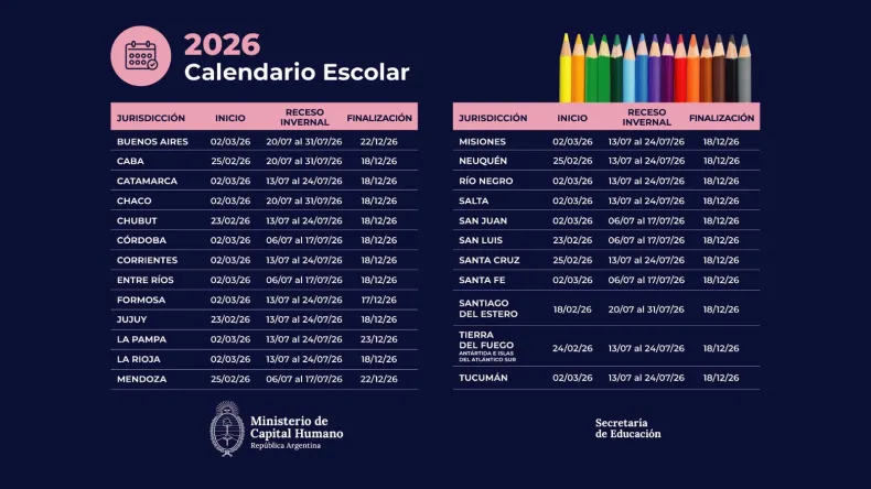 El Ministerio de Capital Humano de la Nación, a través de la Secretaría de Educación, oficializó el calendario escolar completo para el ciclo lectivo 2026 en todo el país. La definición se dio luego de la asamblea N.º 148 del Consejo Federal de Educación, una vez confirmados los feriados nacionales y provinciales.