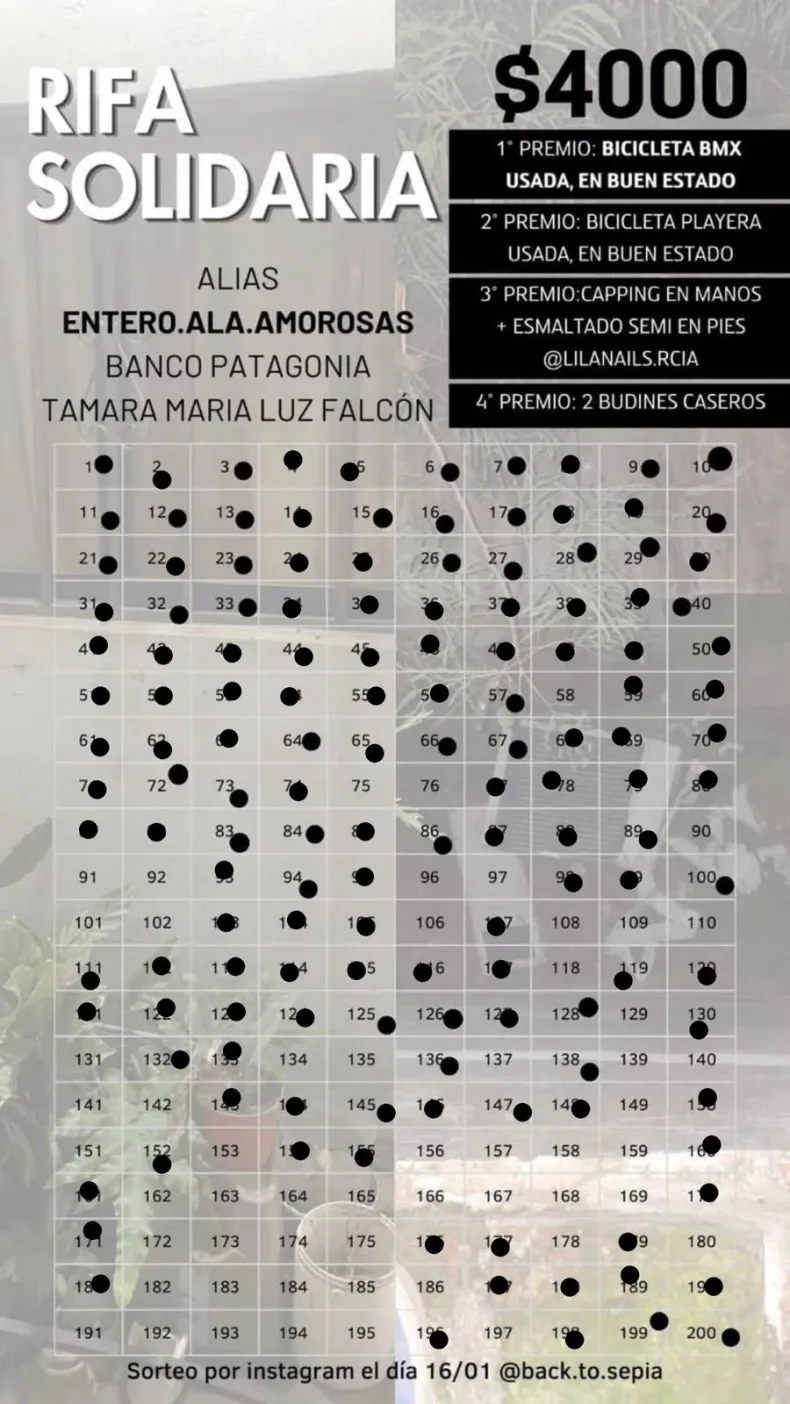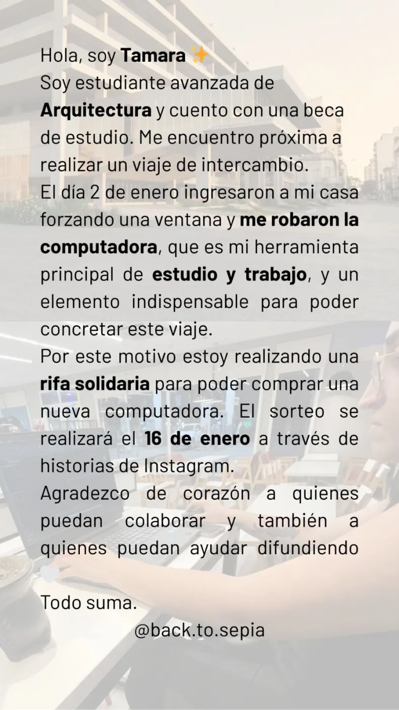 Ante esta situación, la joven decidió impulsar una rifa solidaria con el objetivo de reunir fondos y poder adquirir una nueva computadora. El valor de cada número es de $ 4.000 y el sorteo se realizará el 16 de enero a través de historias de Instagram, en la cuenta @back.to.sepia.