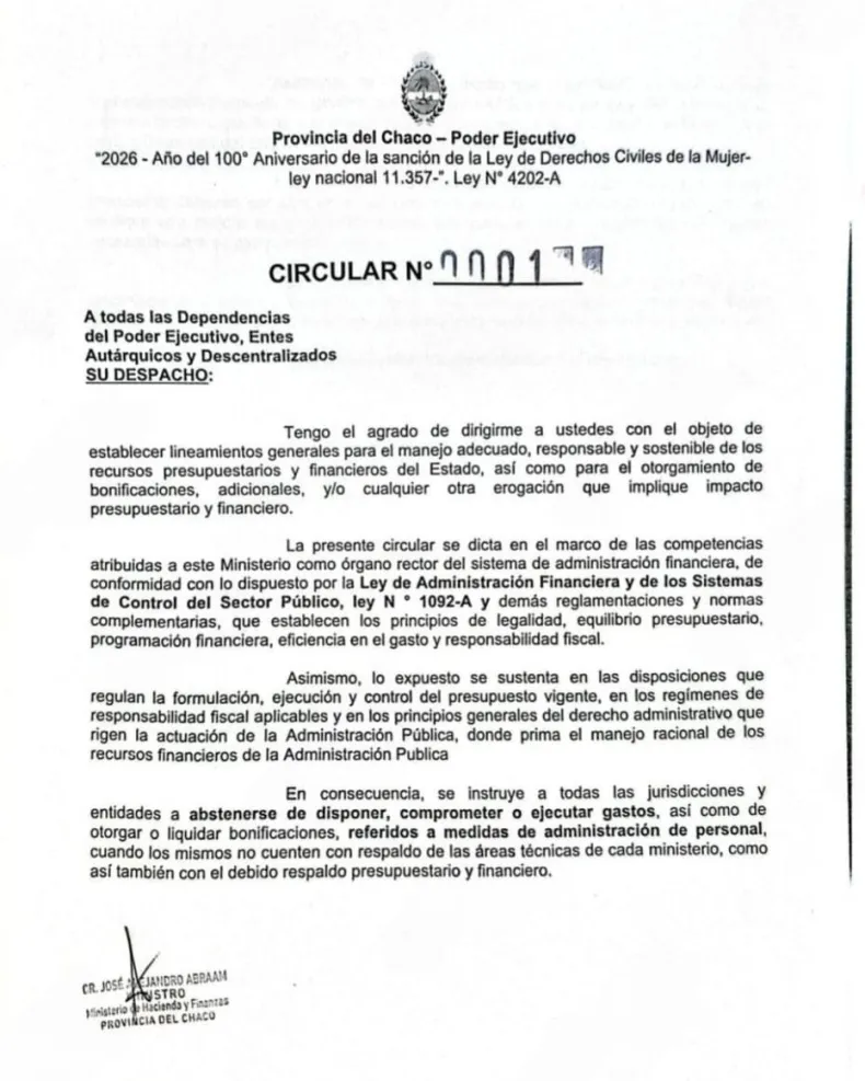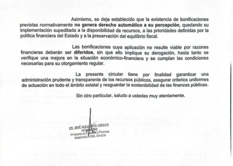 El documento, instruyó a todas las jurisdicciones, entes autárquicos y organismos descentralizados del Poder Ejecutivo a abstenerse de disponer, comprometer o ejecutar gastos vinculados a bonificaciones o adicionales que no tengan garantizados los recursos necesarios para su pago.