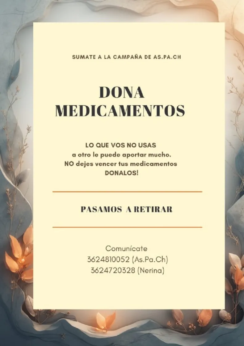 Para contactarse, tienen dos números habilitados: 3624810052 (As.Pa.Ch) y 3624720328 (Nerina). "Todo es vía WhatsApp. Hacemos el contacto y después el solicitante pasa a retirar el medicamento por el domicilio de la persona que lo dona o se le manda de alguna forma. Todo es virtual; primero pedimos que nos manden la receta de lo que necesitan y alguna foto de cuando lo reciben", explicó Barbona sobre cómo funciona esta cadena solidaria.