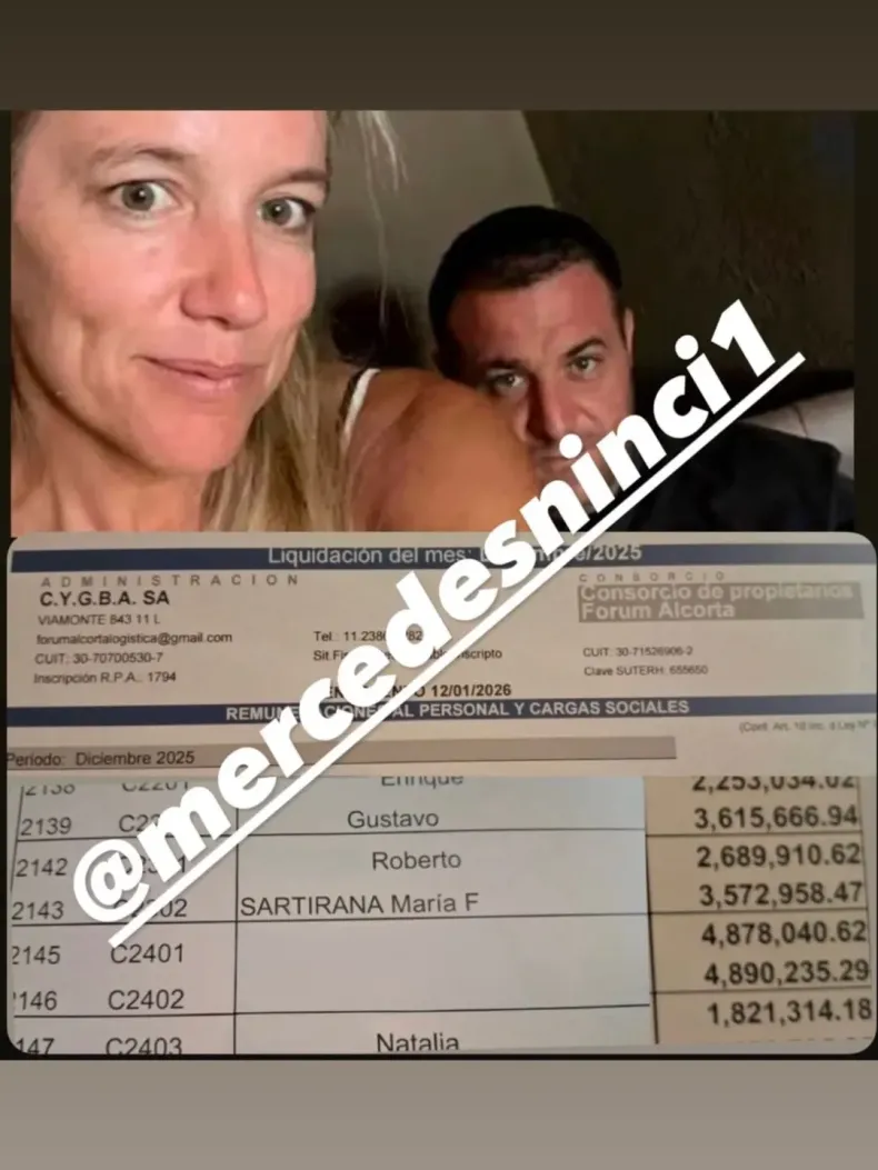 La periodista también detalló el alto nivel de gastos del inmueble y aseguró contar con documentación respaldatoria. "Tengo documentos donde consta cuánto paga Florencia Sartirana de expensas: $ 3.572.958 pesos nada más", sostuvo, y añadió que los departamentos del complejo estarían valuados entre 6 y 8 millones de dólares.