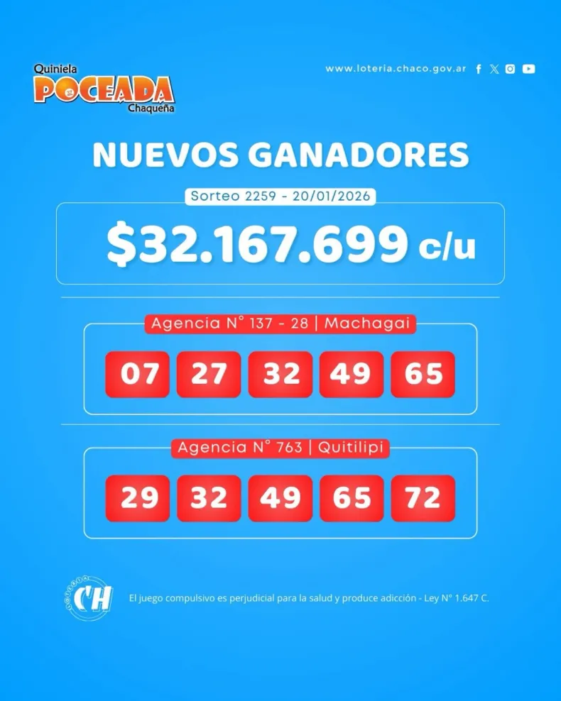La Quiniela Poceada Chaqueña tuvo este martes dos nuevos ganadores en el Sorteo N° 2259, realizado el 20 de enero de 2026, con un premio individual superior a los 32 millones de pesos.
