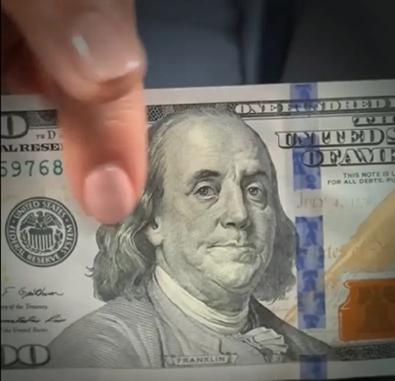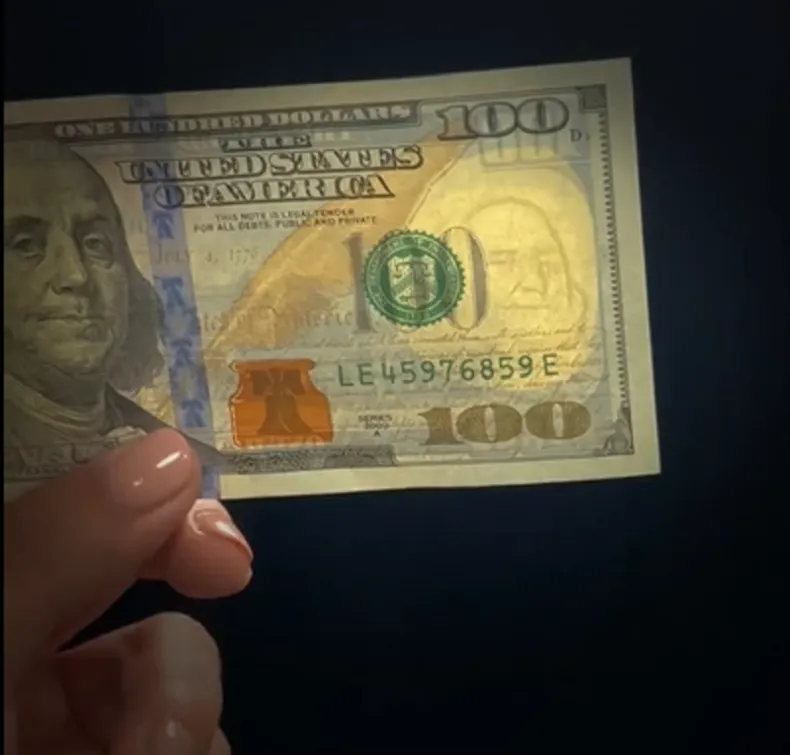 El segundo paso es poner el billete bajo la luz y mirar detenidamente la marca de agua en la parte blanca para verificar los elementos de seguridad visibles a trasluz, como la imagen que representa la figura del prócer y el hilo de seguridad con la inscripción "USA" y el valor del billete.