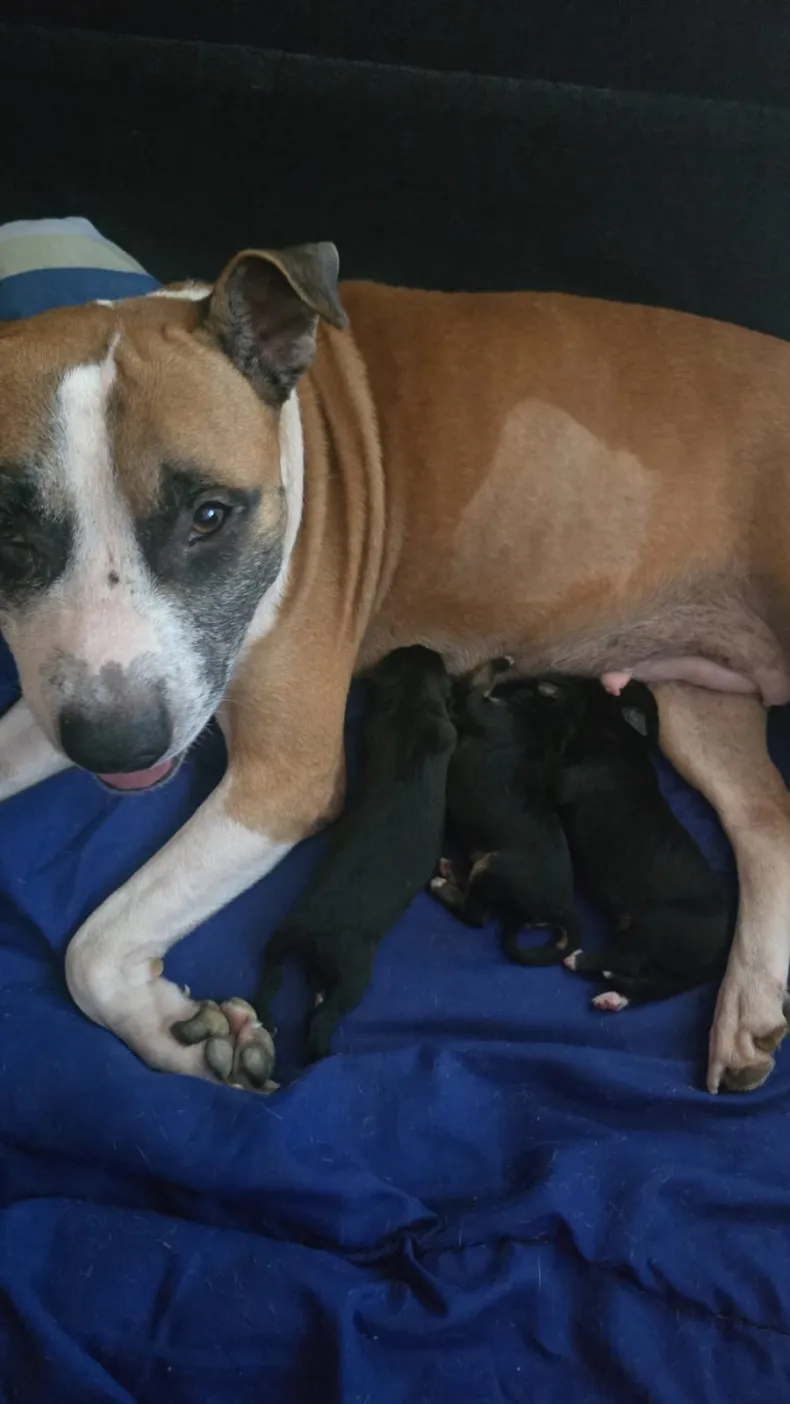 Atenea a los días del impacto: fue mamá, pero perdió a su único cachorro. El bebé nació con labio leporino, no podía respirar ni alimentarse correctamente y falleció a los dos días. Tras la pérdida, la perra comenzó a producir gran cantidad de leche y, en medio buscaba cachorros recién nacidos para poder amamantar.