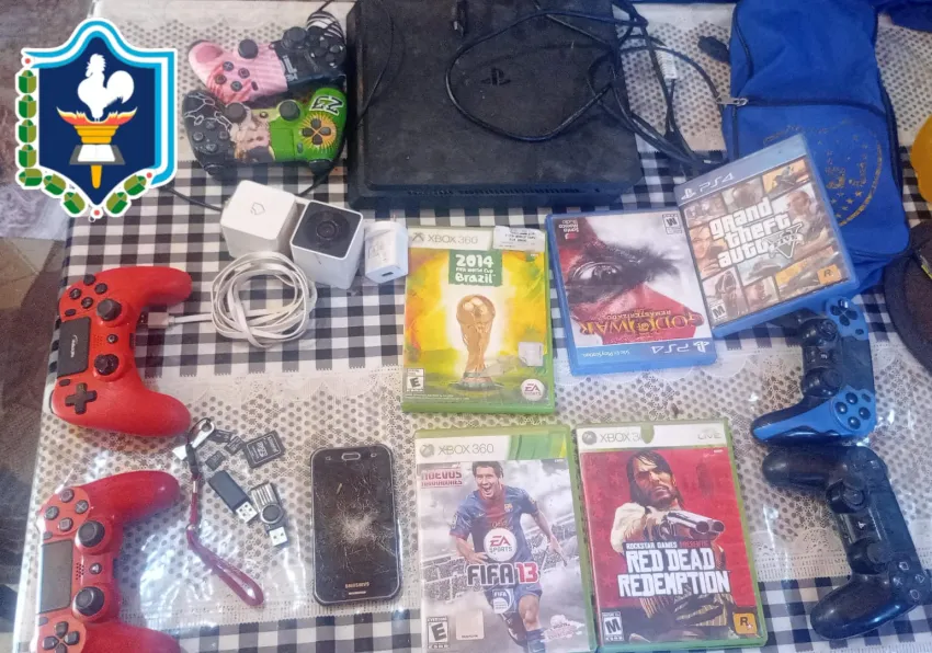 Durante el operativo se secuestraron distintos dispositivos electrónicos, entre ellos consolas de videojuegos, controles, pendrives, tarjetas de memoria, juegos, una cámara de seguridad y teléfonos celulares.