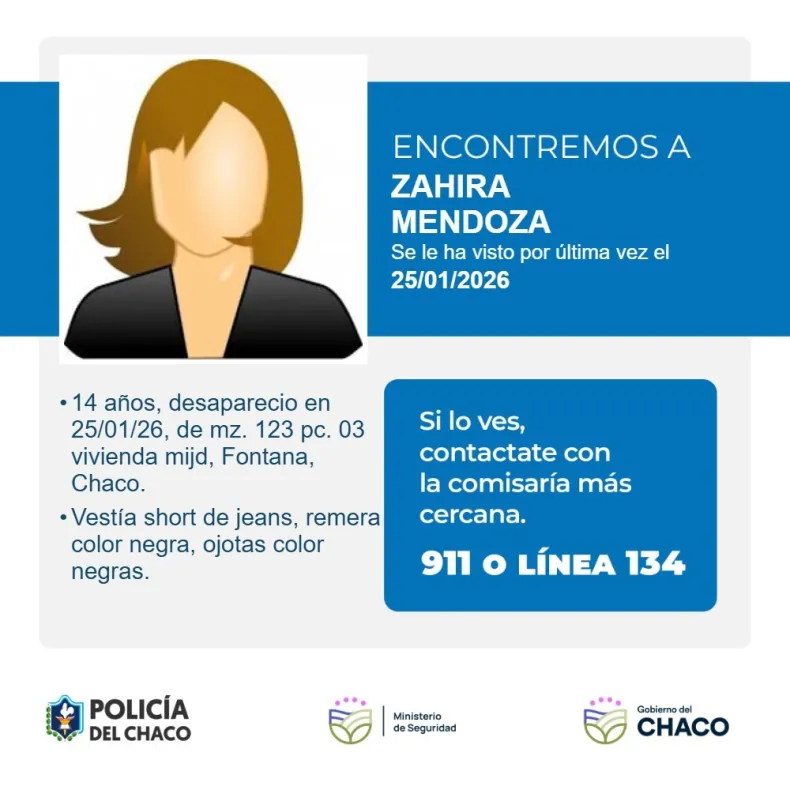 La Policía del Chaco, en base a denuncias registradas en la Comisaría Primera de Fontana, inició un operativo para dar con el paradero de dos menores desaparecidas: Nadia Sánchez, de 10 años, y Zahira Mendoza, de 14 años.
