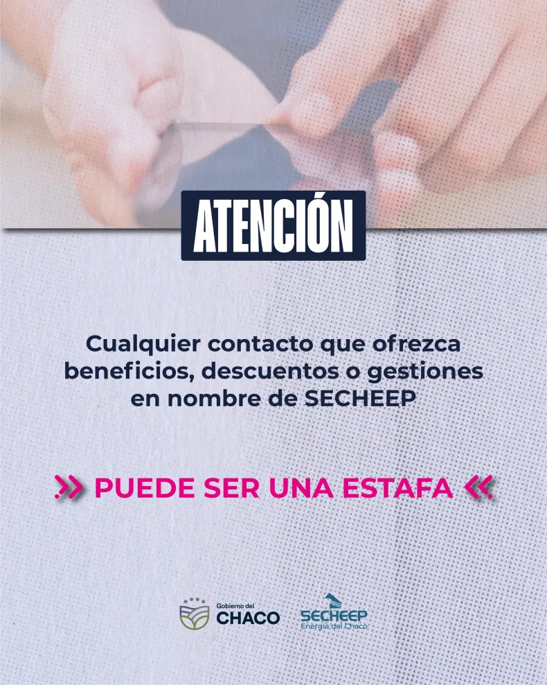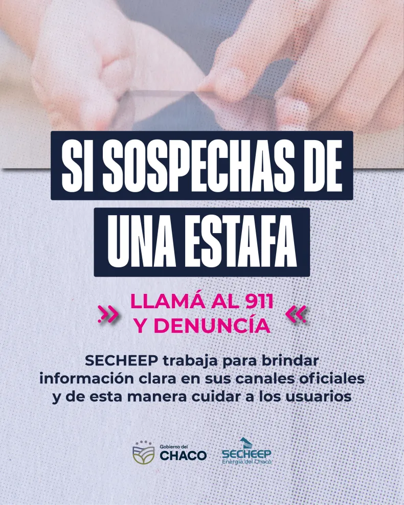 La empresa energética SECHEEP advierte a la comunidad sobre intentos de estafas realizados por personas que utilizan de manera fraudulenta el nombre de la compañía para engañar a usuarios. A su vez, remarcaron que trabajan permanentemente para brindar información clara y segura a través de sus canales oficiales, con el objetivo de proteger a los usuarios y evitar que sean víctimas de maniobras delictivas.
