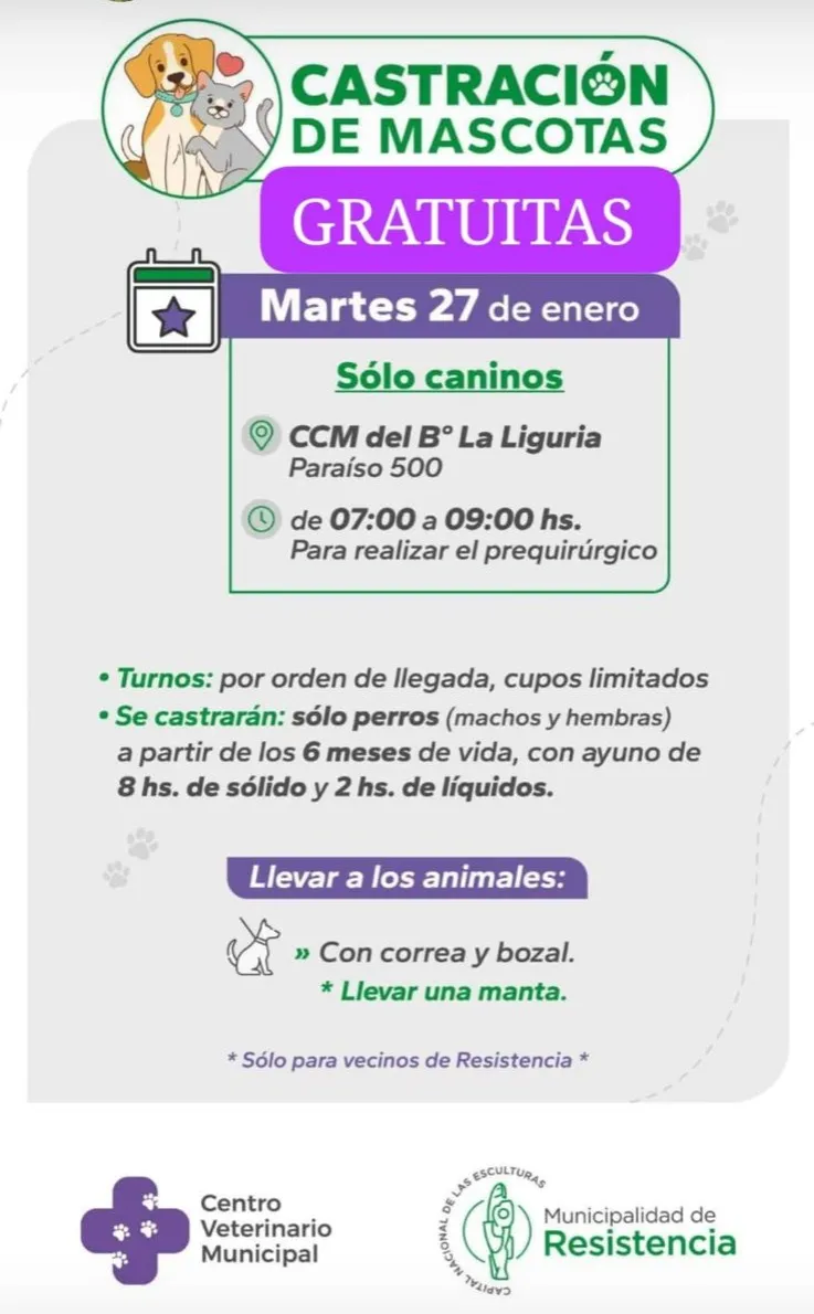 La Municipalidad de Resistencia llevará adelante una nueva jornada de castración gratuita de mascotas, destinada exclusivamente a perros, este martes 27 de enero en el Centro Comunitario Municipal (CCM) del barrio La Liguria, ubicado en Paraíso 500.