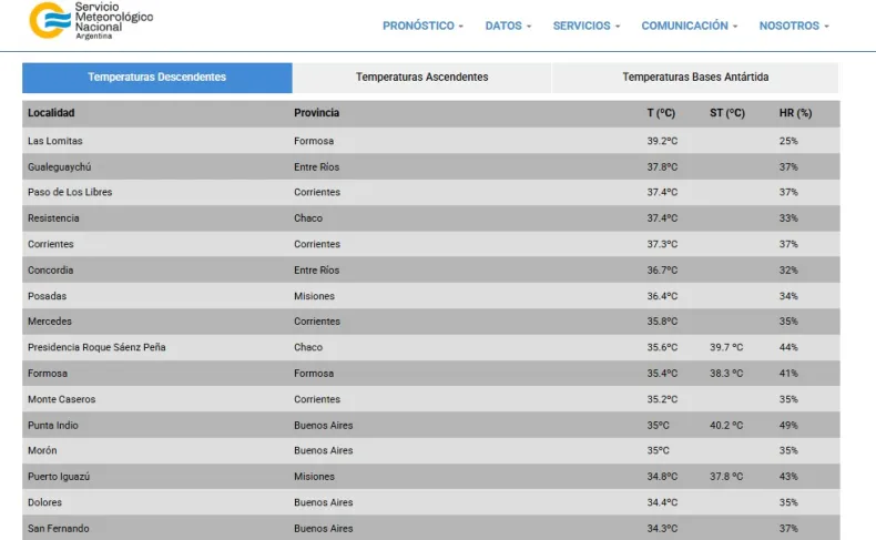 En tanto, Sáenz Peña también figuró entre las localidades más afectadas: registró 35,6°C, pero con una sensación térmica de 39,7°C y una humedad del 44%, lo que la posicionó en el octavo lugar del listado nacional.