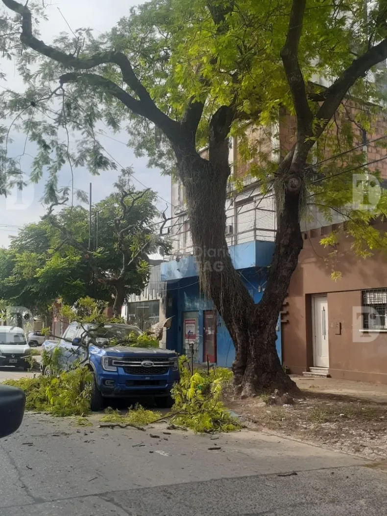 Una rama de un árbol cayó sobre una camioneta estacionada en pleno centro