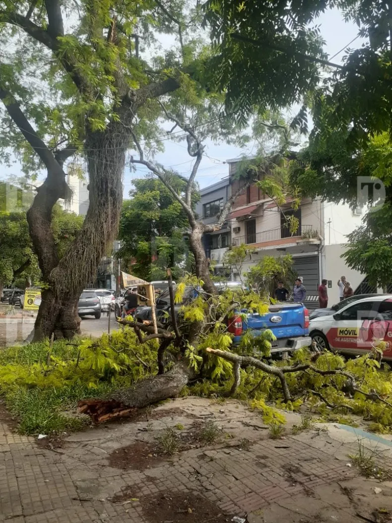 En las imágenes registradas por Diario TAG se observa además un cartel de señalización doblado producto del impacto, lo que evidencia la fuerza con la que cayó el árbol. El tronco principal permaneció en pie, pero una de sus ramas más pesadas fue la que cedió y provocó el incidente.