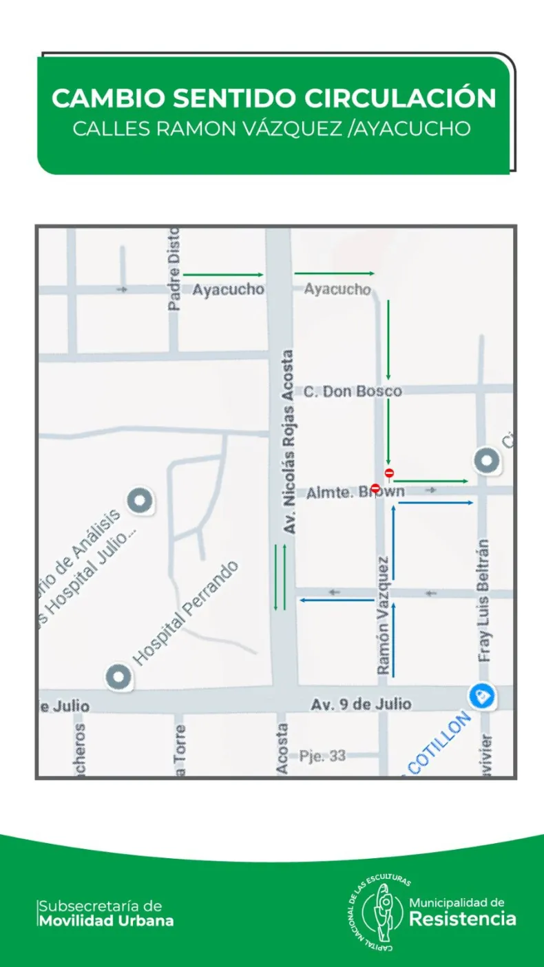 La calle Ramón Vázquez, paralela a la Avenida Nicolás Rojas Acosta, tiene sentido desde Avenida 9 de Julio hacia Avenida Paraguay. Luego, desde calle Brown se invierte hasta Ayacucho, quedando sentido descendente hacia Av. 9 de Julio. Por lo tanto, quienes circulen desde Av. 9 de Julio deberán girar obligatoriamente hacia calle Almirante Brown.